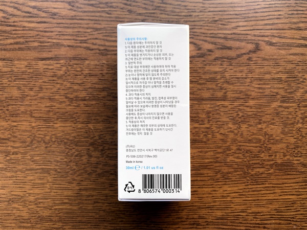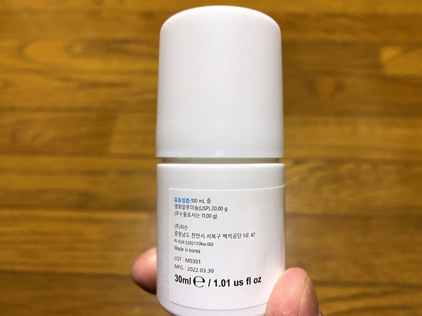 韓国語なのでやはり読めませんが、「30ml」「韓国製」「製造日」「製造番号」などの情報は読み取れました。